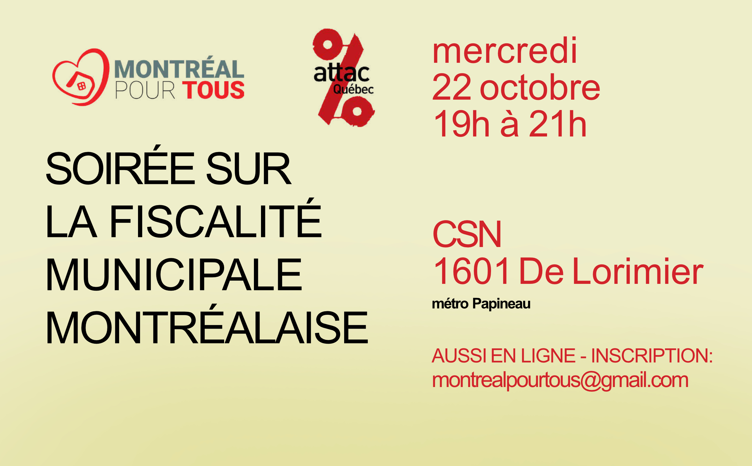 Montréal pour tous et Attac Québec, deux associations de citoyen.nes, appuyées du Conseil Central du Montréal Métropolitain de la CSN, organisent un événement sur la fiscalité montréalaise pendant la campagne électorale, mercredi le 22 octobre, 19h, Édifice de la CSN au 1601 De Lorimier